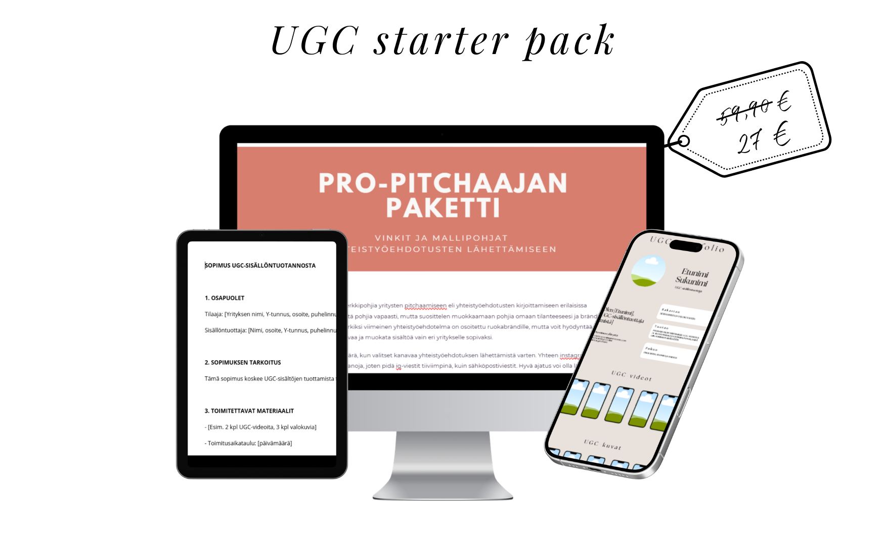 ➡️Näiden lisäksi starter packista löytyy UGC-sopimuspohja, jota tulet tarvitsemaan yhteistöitä solmiessasi. Kaikki yhteistyön ehdot on aina hyvä kirjata selkeästi esille, jotta sekä sinä että yritys tiedätte täsmälleen, mistä on sovittu. Sopimuksen tekee ja lähettää yleensä UGC-sisällöntuottaja yritykselle, joten sopimuksen tulisi olla sinulla tavalla tai toisella rakennettuna ja käytettävissä. Tämän sopimuspohjan avulla voit klousata yhteistyöt turvallisesti ja ammattimaisesti. Sopimus on tarkastettu lakimiehellä.